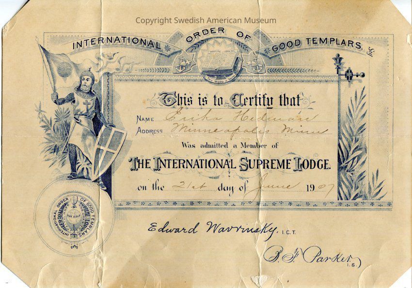 Certificate for Erika Hedman of Minneapolis, Minnesota, certifying membership to the International Supreme Lodge of the International Order of Good Templars (IOGT) on June 21, 1907.Context