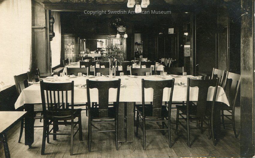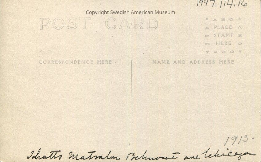A black-and-white photograph postcard of the dining room at Cafe Idrott on Belmont Avenue, Chicago. Handwritten on the reverse side of the postcard, "Idrotts Matsalar Belmont ave Chicago, 1913." (Idrott's dining rooms, Belmont Avenue, Chicago 1913).Acquisition
