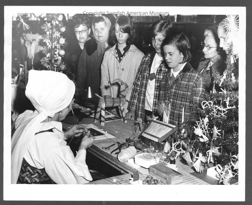 A significant proportion of early 20th century Swedish immigrants were women. Many of these women brought with them their handicraft skills and continued to decorate with, produce, and sell straw items in the United States. Rye and wheat straw are most commonly used in handicraft. Ornaments, hats, toys, placemats and bridal crowns are some examples of women's straw work.