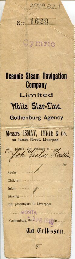 Beige ticket for a boat ride with the inscription, "N:R 1629. Cymric. Oceanic Steam Navigation Company Limited, White Starline, Gothenburg Agency. Mess:R.S. Ismay, Imrie & Co.-30 James Street, Liverpool to Boston, 1 April 1911." written on a beige background in black letters.Acquisition