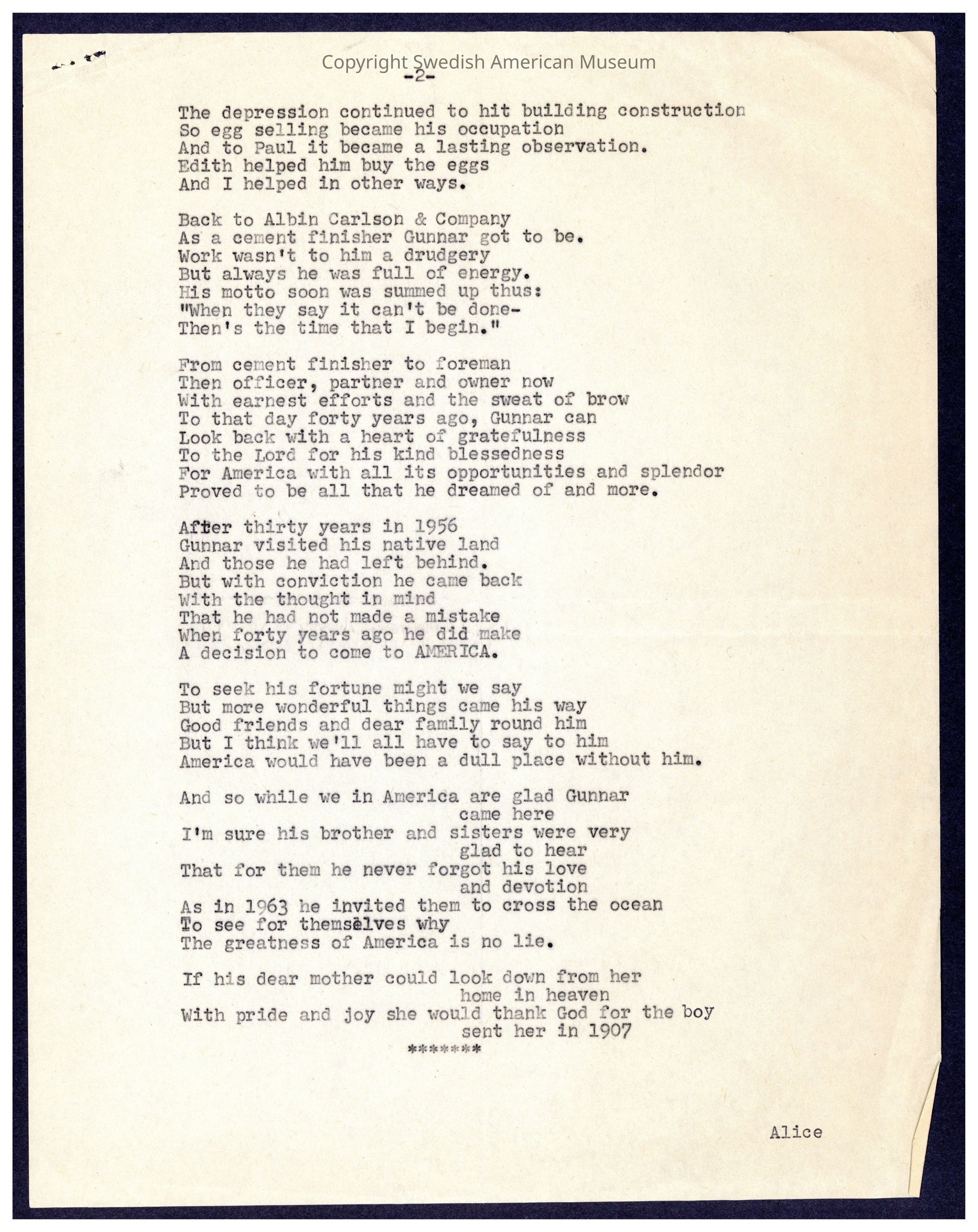 Collection of biographical materials, photographic material, printed material, and writings relating to members of the Burgeson family, who were active in Chicago's Swedish American community throughout the 20th century.