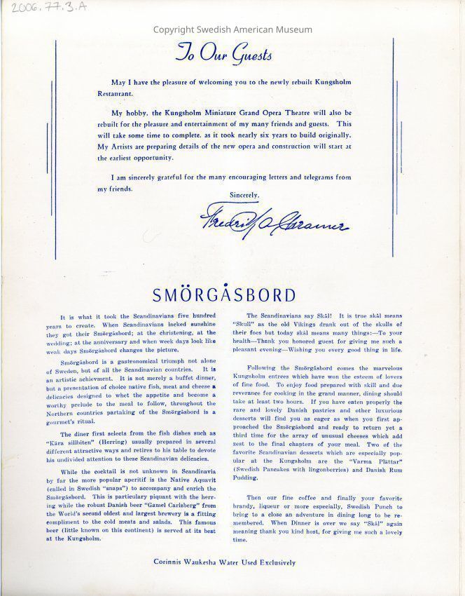 Danish-born immigrant Fredrik Chramer remodeled the McCormick Mansion in 1937 into a Swedish style restaurant with multiple dining rooms in blue, gold and pink. The restaurant included private dining rooms and buffet style food such as smörgåsbord. Inspired by puppet shows from his childhood, Chramer opened the Kungsholm Miniature Grand Opera Theater together with the “father” of the puppet-opera Ernest Wolff in 1940, in an adjoining building to the restaurant. The restaurant and theater were operated in conjunction by Chramer.