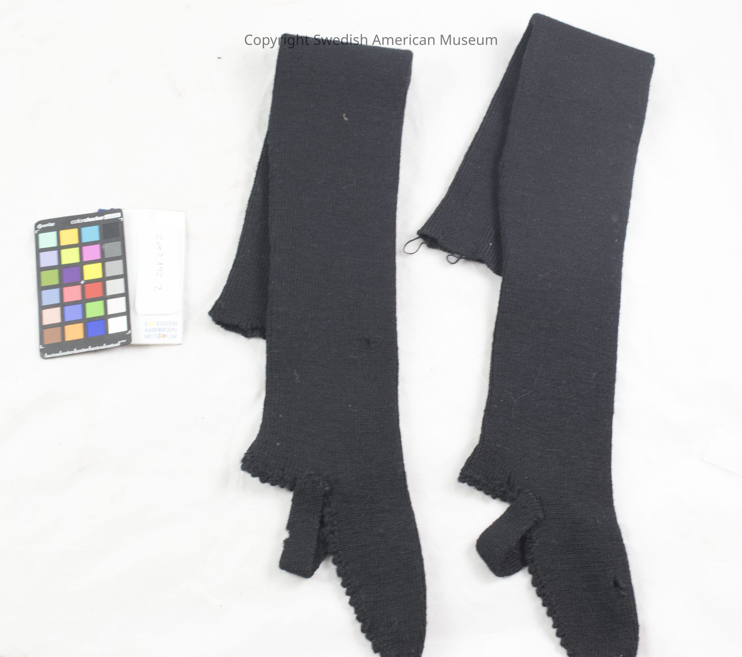 Pair of black knitted leggings for a girl made of wool. The top parts have openings so the leggings can be put on in the first place while the fronts of the bottom parts where the feet are supposed to go also have openings, though these bottom parts are held to the feet with straps.Acquisition