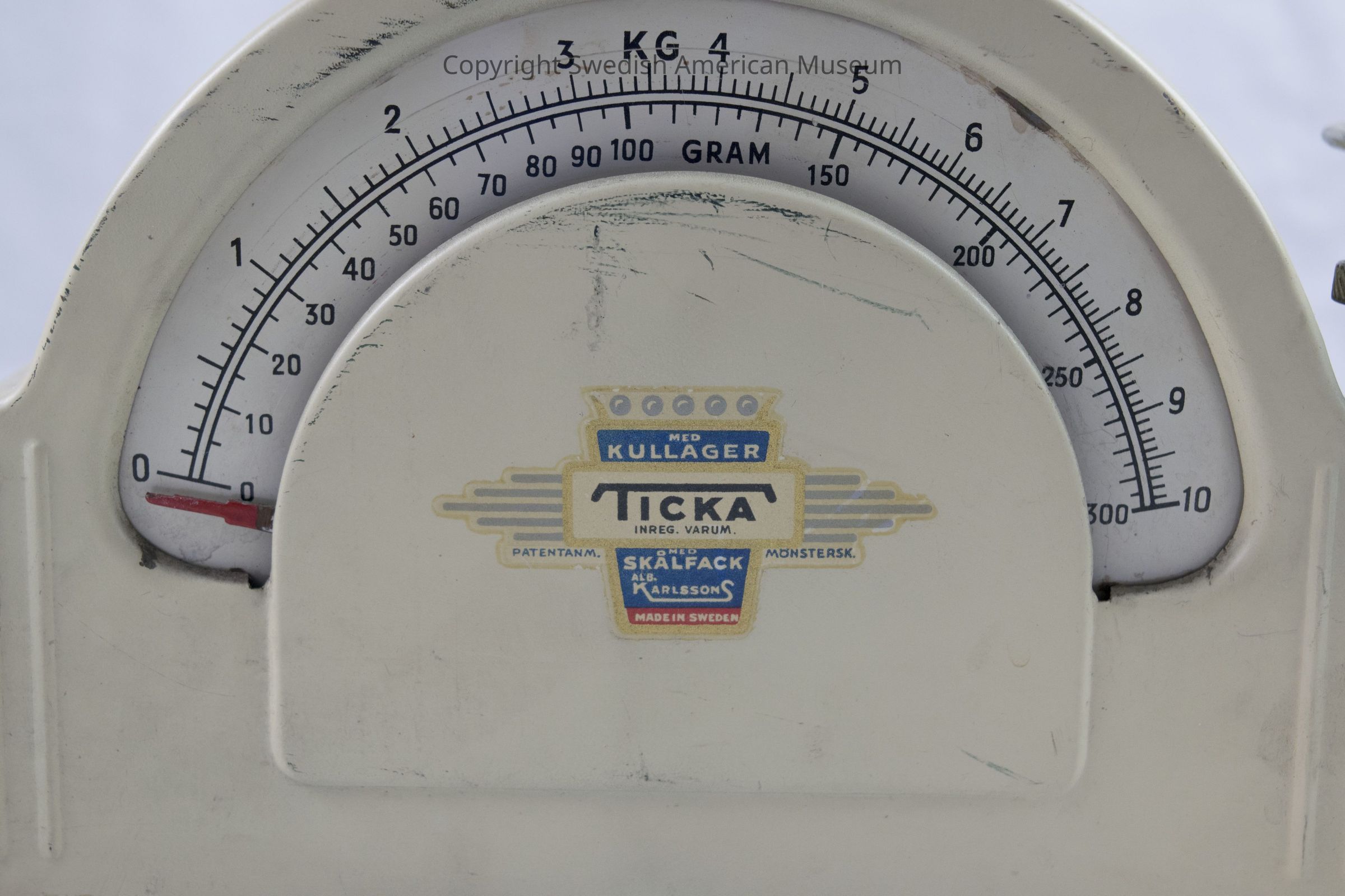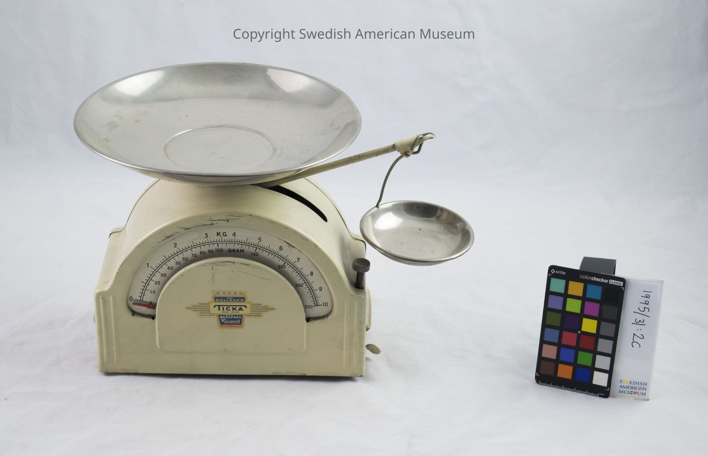 Cream colored "Ticka" kitchen scale with stainless steel plate and side bowl.
