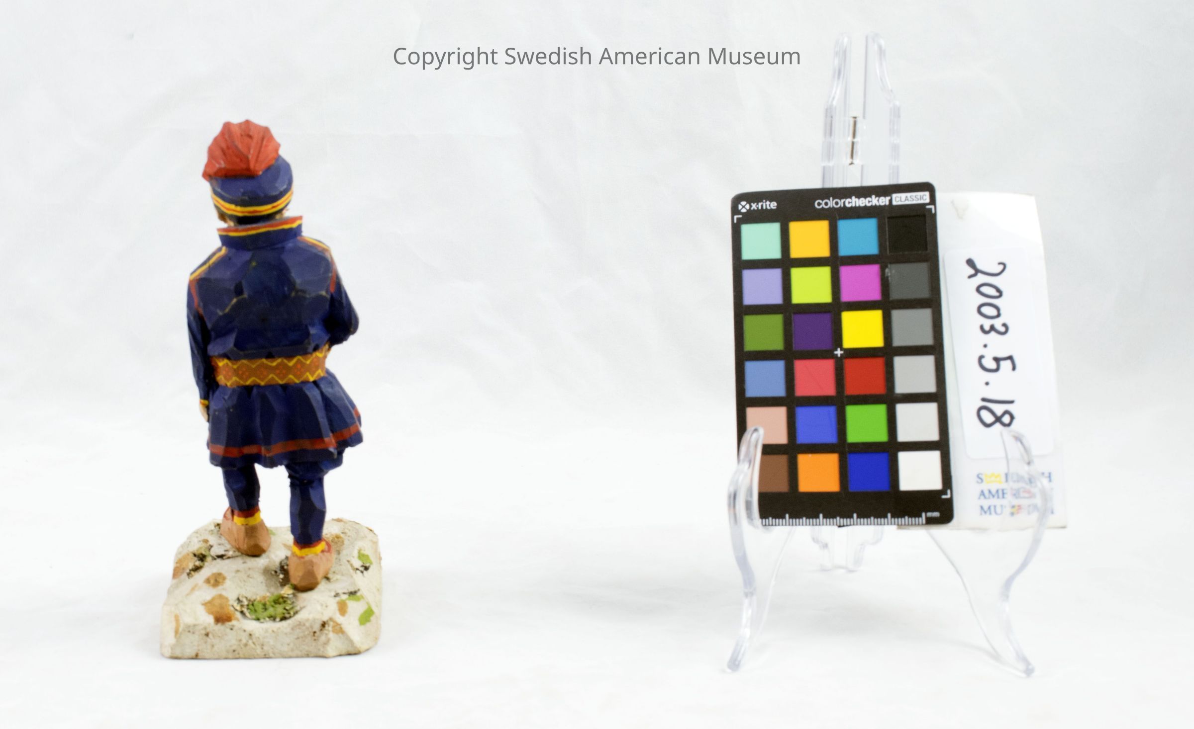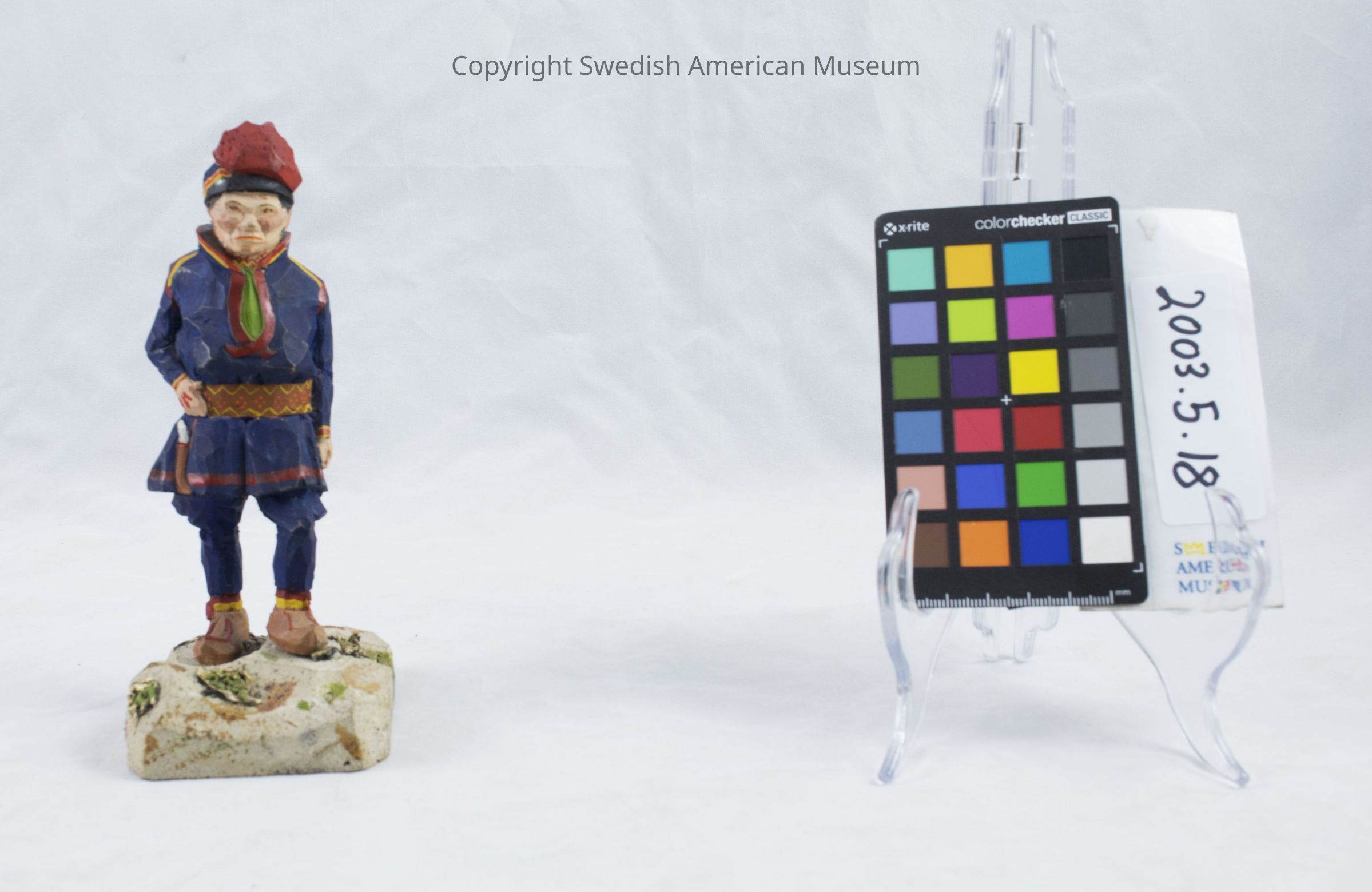 Wooden Sámi male carving standing on a platform with lots of ridges. The figure is wearing traditional Sami clothing, including a predominantly blue coat (known as a gakti), blue trousers, brown shoes, and a blue hat with a thick and rounded red top.