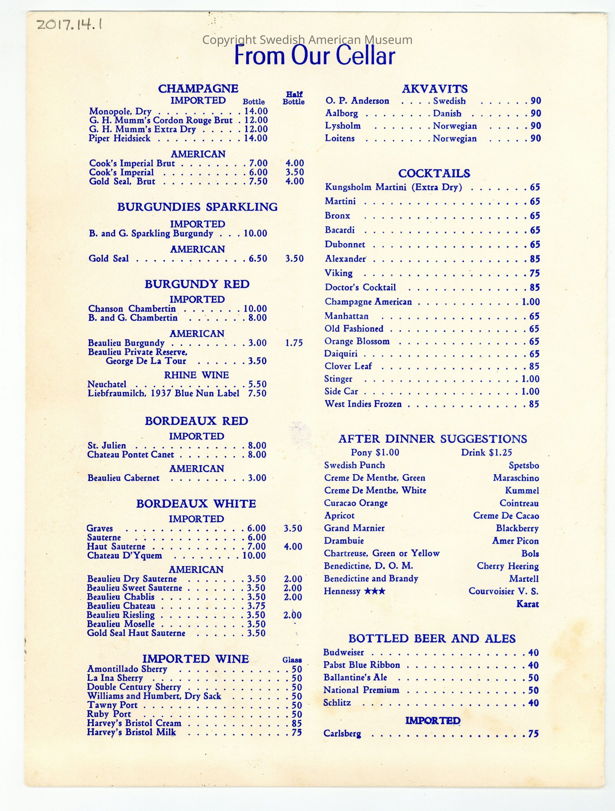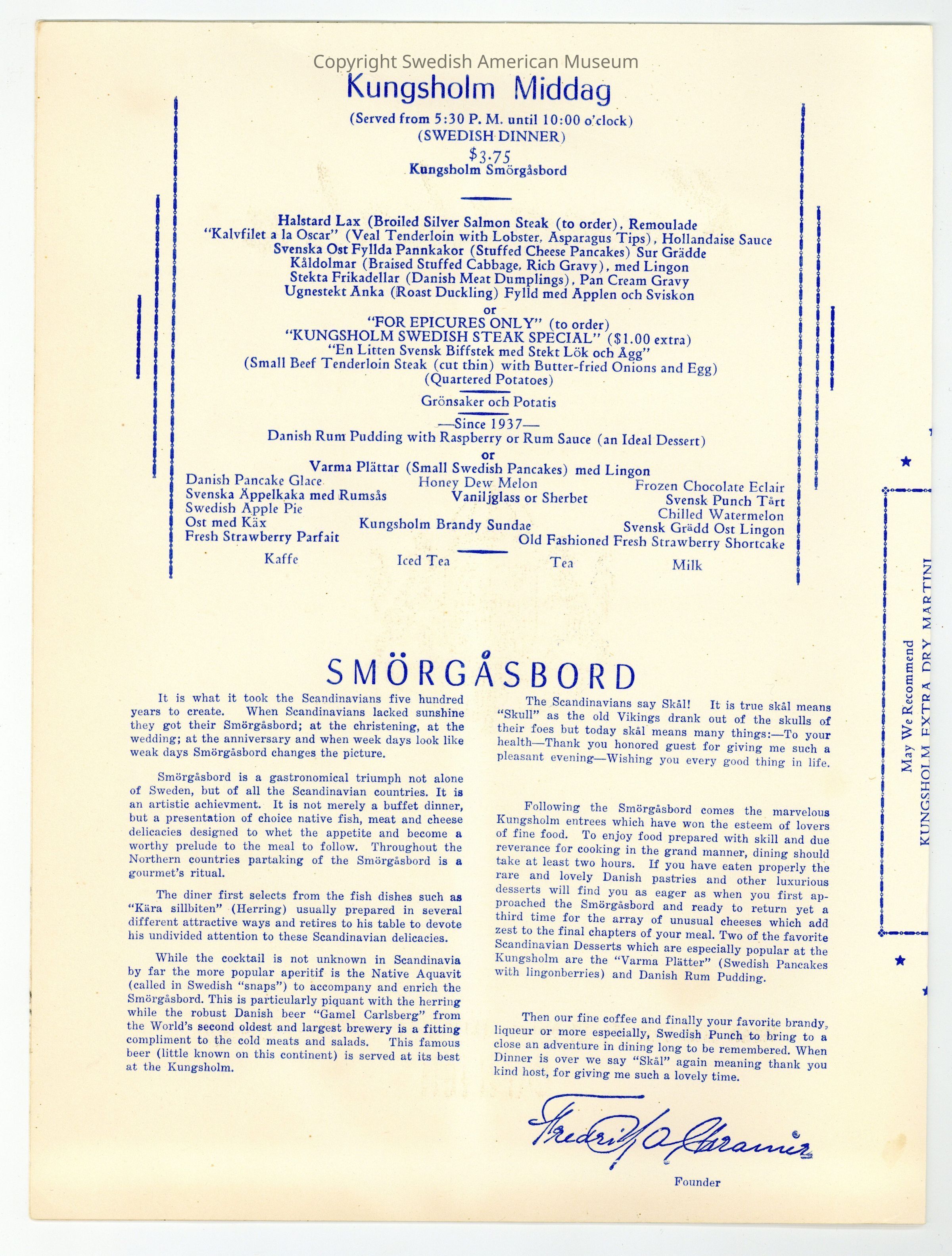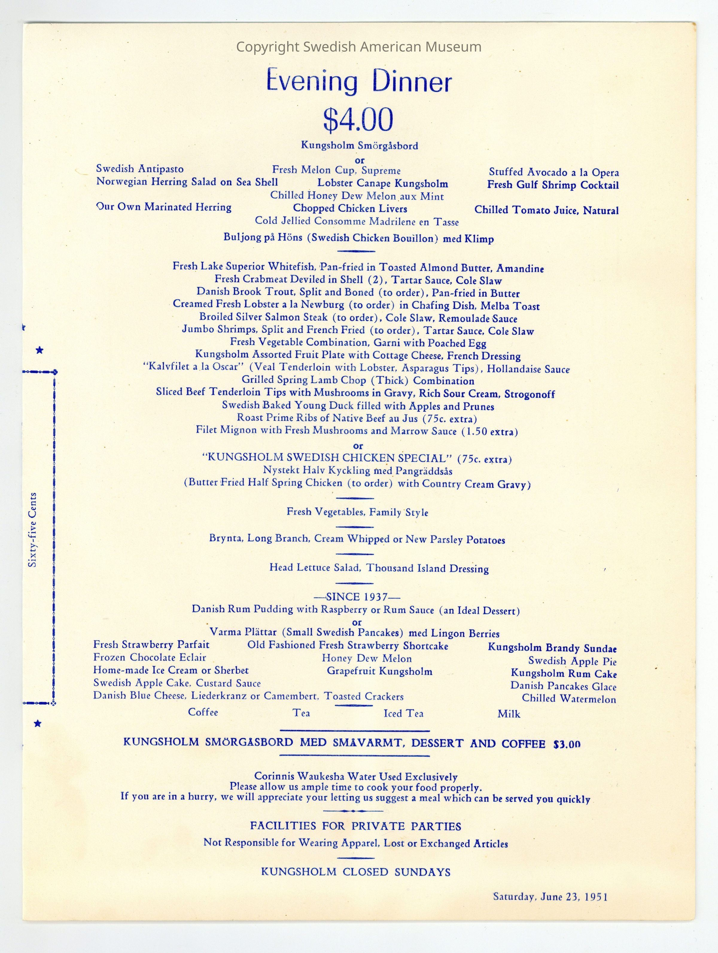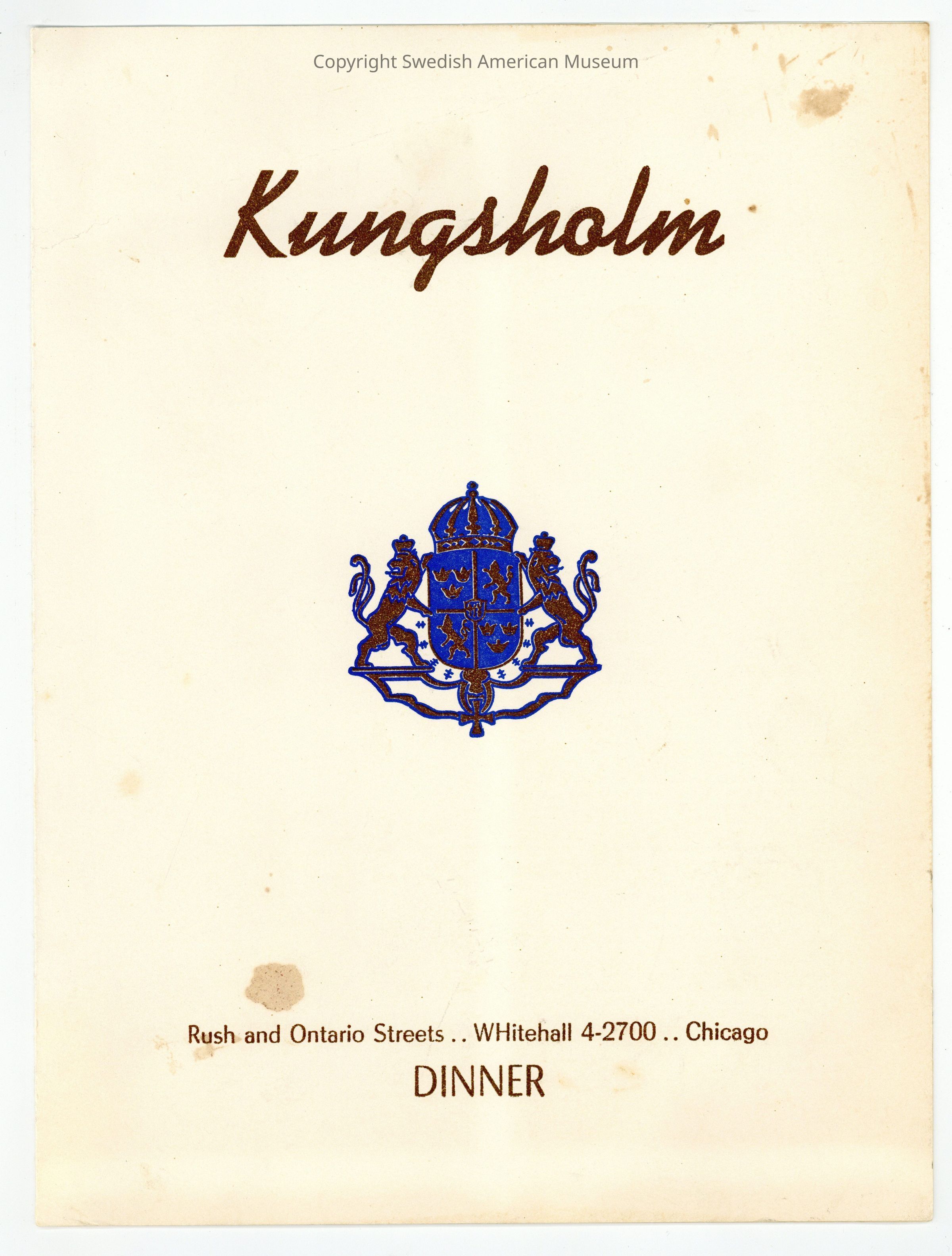 Dinner menu from the Kungsholm Restaurant, dated Jun. 23, 1951. The restaurant served a wide variety of Scandinavian dishes and was famous for its puppet theater which customers watched while they were consuming their food and beverages. The front cover is decorated with the coat of arms of Sweden.Context