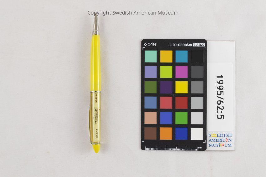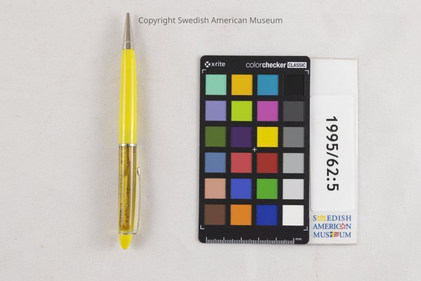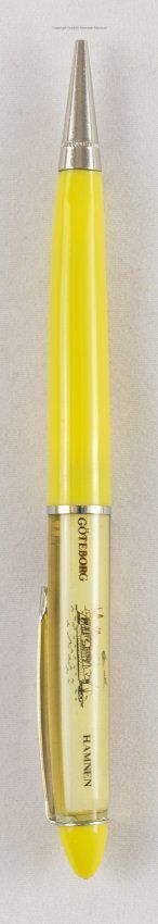 Yellow, plastic ink pen for Swedish American Line. Item has a "floating ship" which moves within its window on the top of the pen. The background is Gothenburg's harbor.Context