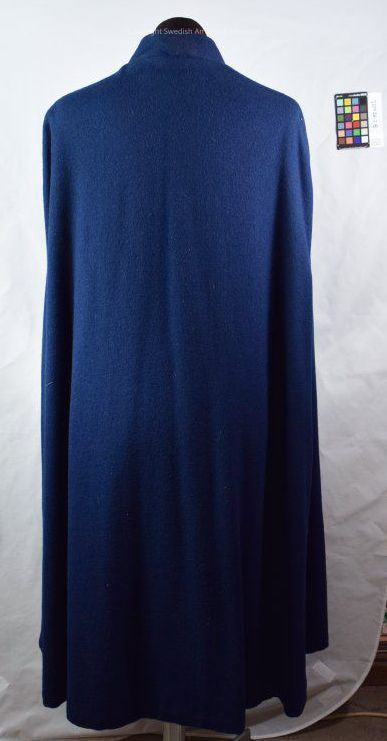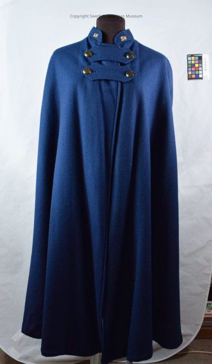Cloak or cape part of a Augustana Student Nurse Uniform. Blue with a predominantly red interior. The upper section of the front's exterior has two attached blue bow-shaped structures, each of which connects to the cape's main part with two black buttons, one of which is on the respective left side and one of which is on the respective right side and a pocket which has a predominantly blue exterior and a predominantly red interior.Context