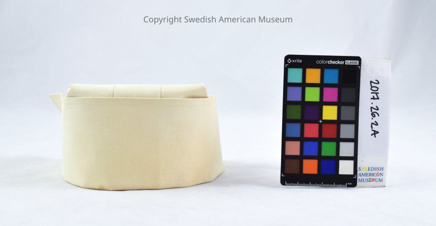 Nurse's cap part of an Augustana Student Nurse Uniform. Off-white with an upper section which is divided into three parts on the outer side and two white buttons, one of which is at the back left end of the outer side, one of which is at the back right end of the outer side, and both of which can go through corresponding inserts in the main part of the item.Context