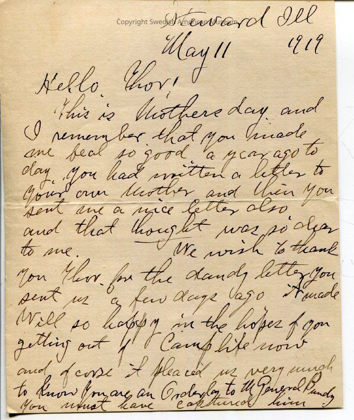 What is Victor S. doing now? Say Thor should there be a soldier comrade who has to come this way as his home trips. You shall be welcome or free to ask him to come along with you, or stop off to see you if they wish to. You must try and get hold of pictures & other souvenirs you will love to have them later on. Just think, either John B. or your brother Einar has not been [here] since you left us. Will & I & V & H are planning to go to Lackland next Tuesday to get our new coats, but Oh! everything is sky high in price now. Lark Kaalaas has bought the Graham farm west of us you know. 160 acres $2.45 per acre. John Allenswang expects his nephew from S Lakota to come & work for him. He's alone yet we all join in best wishes.