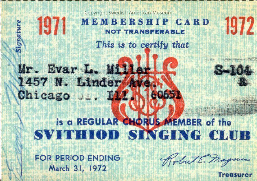 Paper membership card for Svithiod Singing Club, 1971-1972, belonging to Evar L. Miller.Context