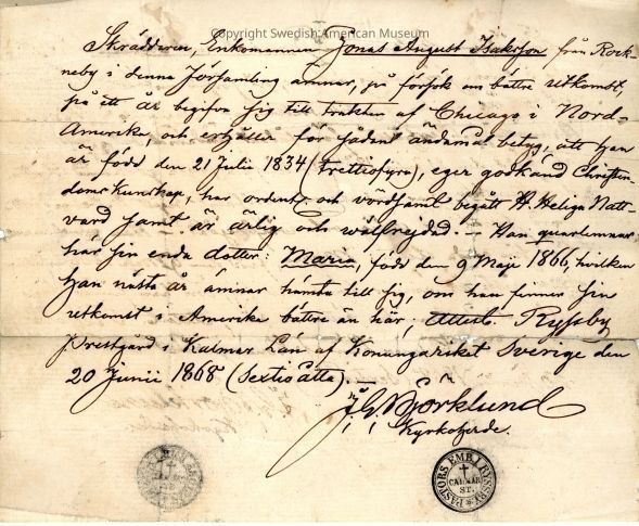 Associated with Jonas August T-- and daughter Maria emigrating from Sweden to Chicago, Illinois.Acquisition
