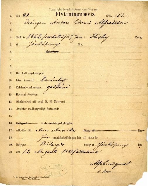 Associated with the immigration of Anders Edvard Alfredsson.