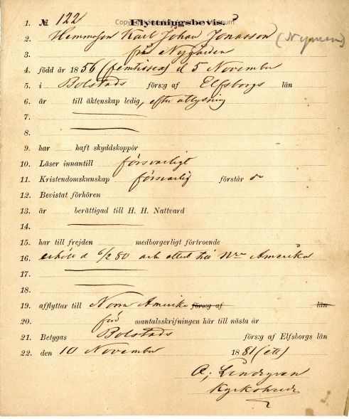 Certificate from Gethsemane Church, 1881.