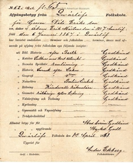 Certificate from Gethsemane Church, 1881.Context