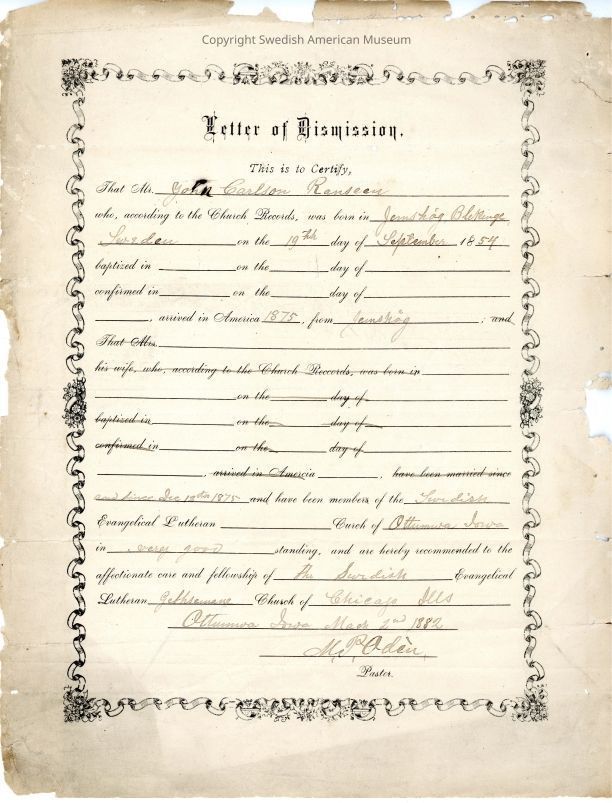 Certificate of dismission from Gethsemane Church, 1882.Context