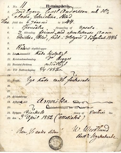 Associated with Carl Andersson and his wife Anna Christina Blod(?).