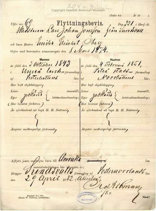 Certificate from Gethsemane Church, 1882.