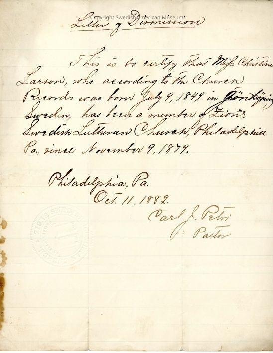 Certificate of dismission, handwritten, from Gethsemane Church.Context