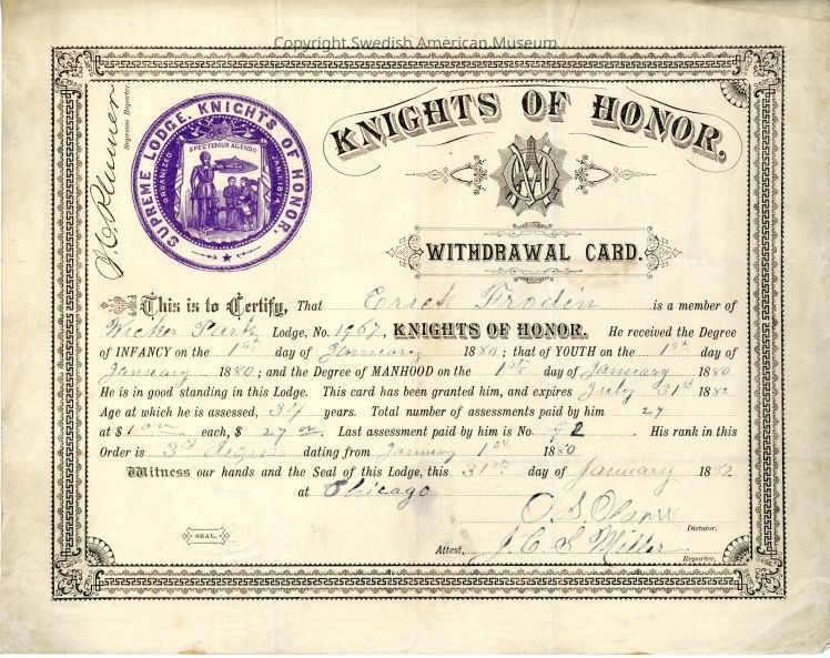Certificate of withdrawal card from the Supreme Lodge Knights of Honor, 1882.