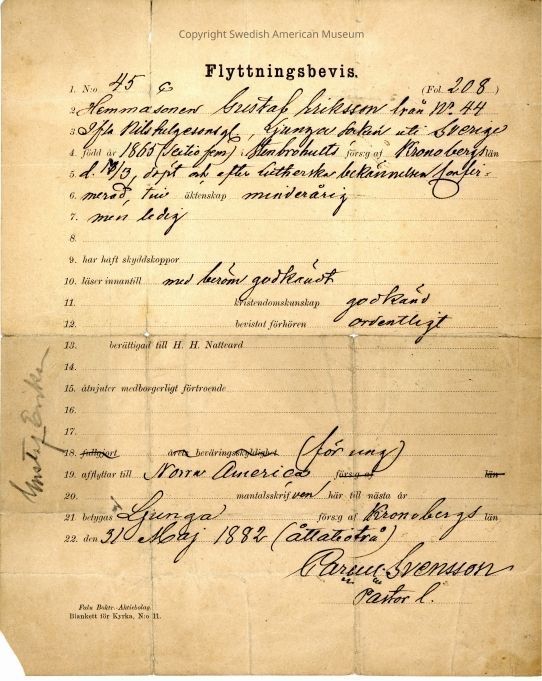 Certificate from Gethsemane Church, 1882.