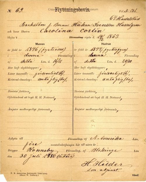 Associated with Hakan Svensson Hasselgren and Carolina Corlin. Signed by H. Heider, Pastor.Acquisition