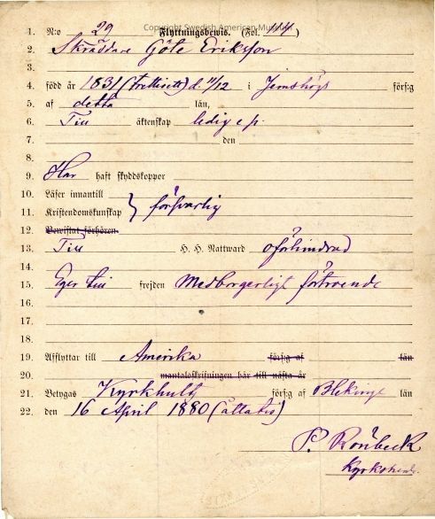 Moving certificate from Gethsemane Church, 1880.Context