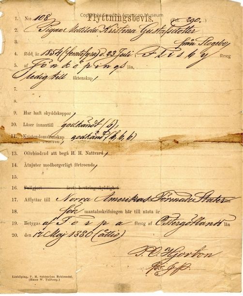 Moving certificate from Gethsemane Church, 1880.