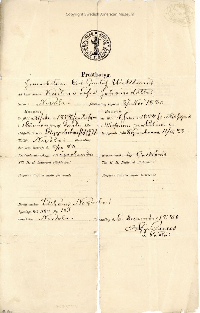 Marriage of Carl Gustaf Wiklund and Kristina Sofia Johansdotter, 1880.Acquisition