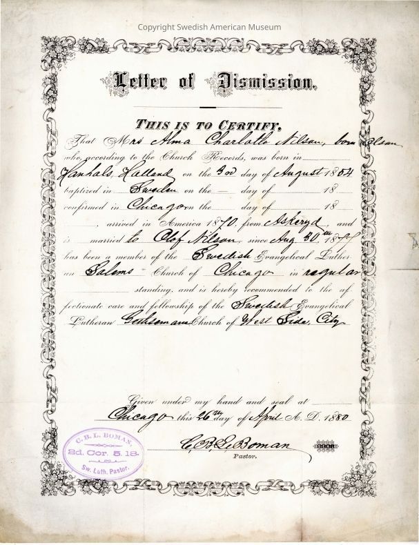 Associated with Alma Charlotta Nilsson and Olof Nilsson from the Swedish Evangelical Lutheran Salem Church of Chicago.Acquisition