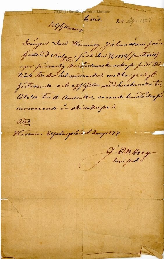 Associated with the immigration of Karl H-- Johansson. Signed by J. Enberg.