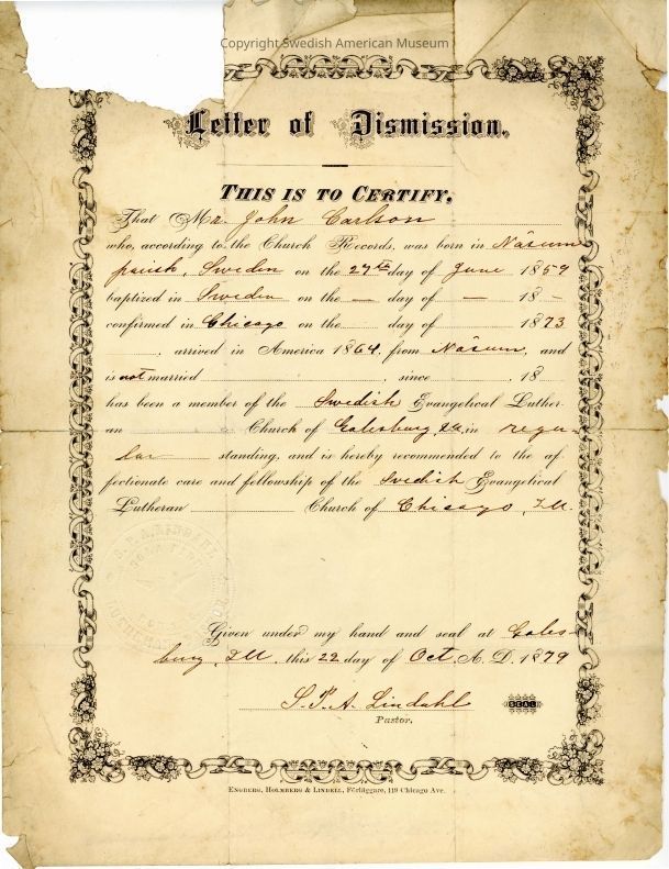 Certificate of Dismission from Gethsemane Church.