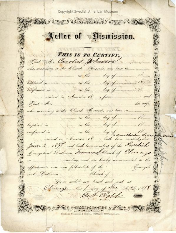 Certificate of Dismission from Gethsemane Church, 1878.