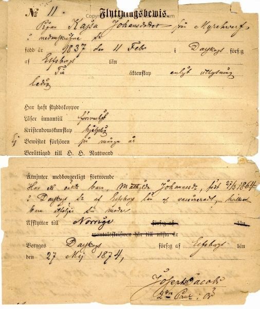 Moving certificate from Gethsemane Church, 1874.Context