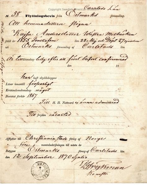 Moving certificate from Gethsemane Church, 1870.Context