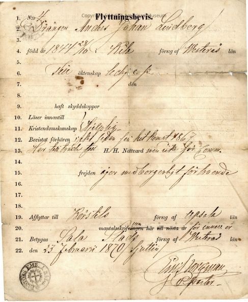 Moving certificate from Gethsemane Church, 1870.Context