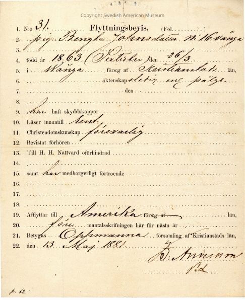 Certificate from Gethsemane Church, 1881.Context