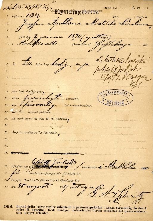 Moving certificate from Gethsemane Church, 1887.
