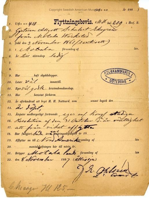 Moving certificate from Gethsemane Church, 1887.