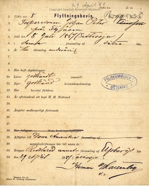 Moving certificate from Gethsemane Church, 1887.