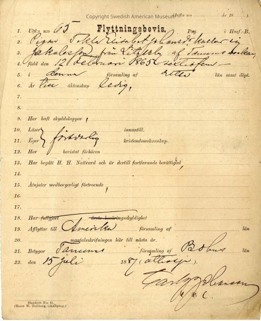 Moving certificate from Gethsemane Church, 1887.