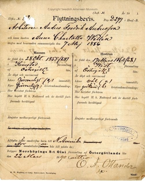 Moving certificate from Gethsemane Church, 1890.