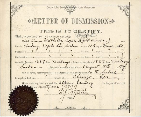 Certificate of dismission from Gethsemane Church, 1891.