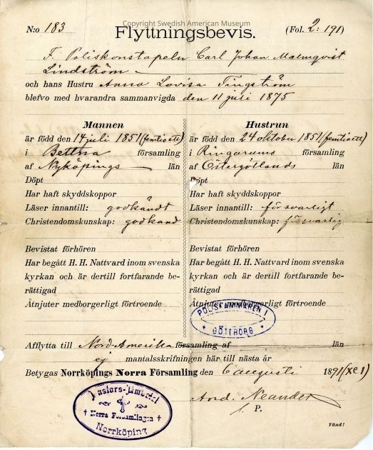Associated with Carl Johan Malmqvist Lindstrom and his wife Anna Lovisa --.Acquisition