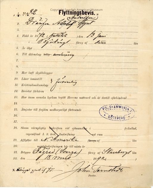Certificate from Gethsemane Church, 1892.Context