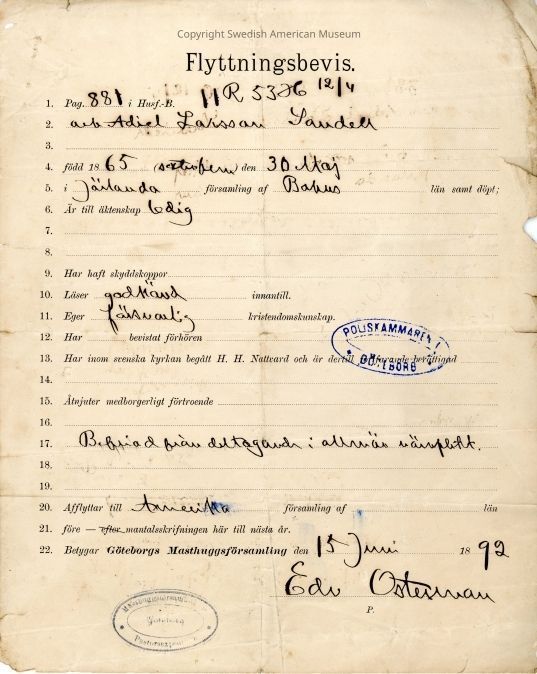 Certificate from Gethsemane Church, 1892.Context