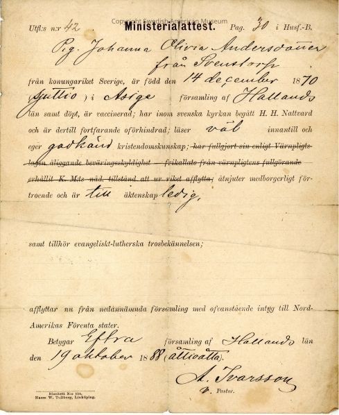 Associated with Johanna Olivia Andersdotter, maid.Acquisition