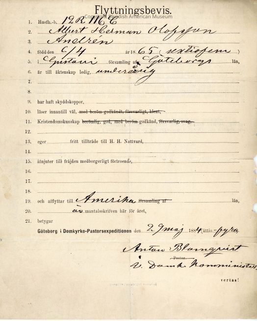 Certificate from Gethsemane Church, 1884.