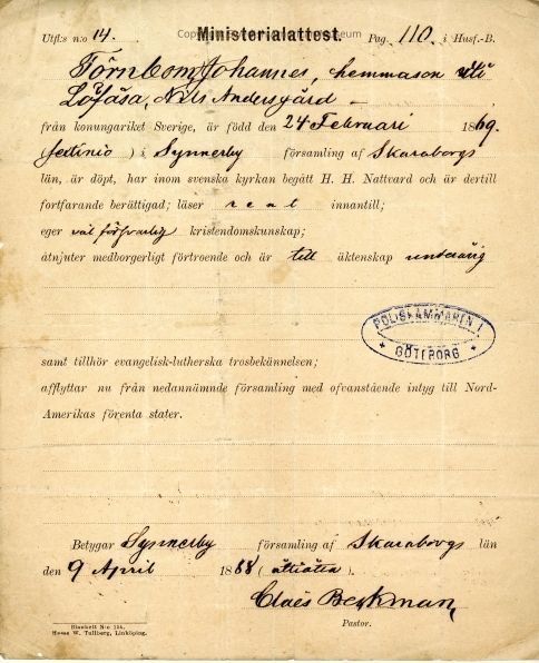 Certificate from Gethsemane Church, 1888.Context