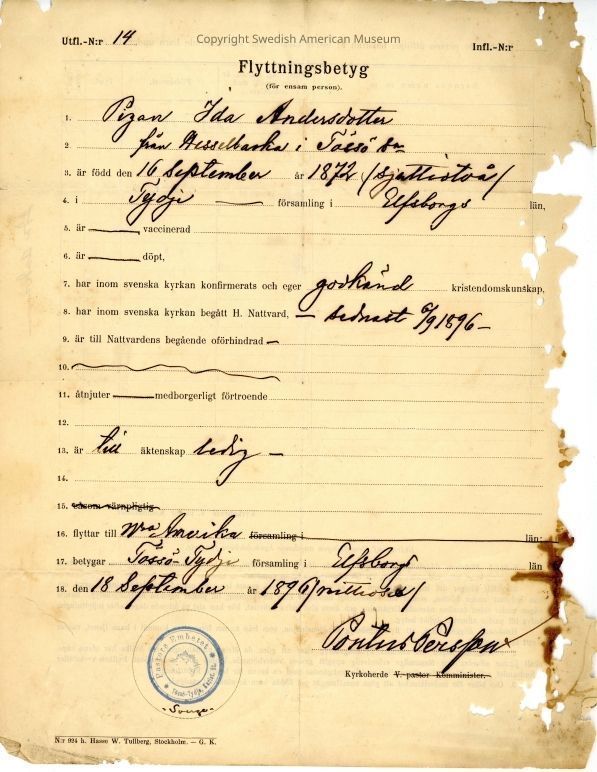 Certificate from Gethsemane Church, 1896.Context